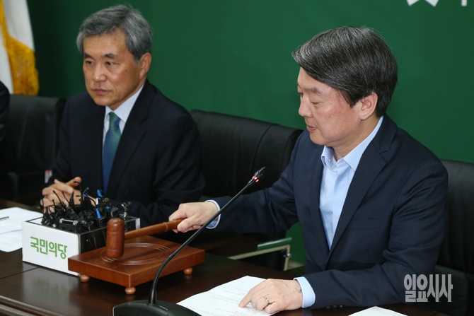 4.13 총선 이튿날인 14일 오전 서울 마포구 국민의당 당사에서 열린 국민의당 선대위 회의에서 안철수 국민의당 공동대표가 의사봉을 두드리고 있다.
