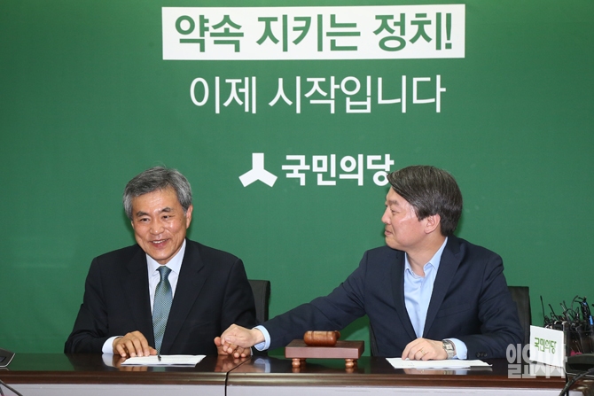 4.13 총선 이튿날인 14일 오전 서울 마포구 국민의당 당사에서 열린 국민의당 선대위 회의에서 안철수 국민의당 공동대표가 이상돈 선대위원장의 손을 잡고 있다.