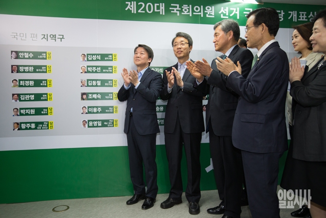 안철수 국민의당 상임공동대표가 14일 오전 마포구 당사에서 선거 상황판에 당선된 후보들의 이름표를 붙이고 박수를 치고 있다. 왼쪽부터 안 대표, 김성식 관악구갑 국회의원 당선자, 이상돈 비례대표.