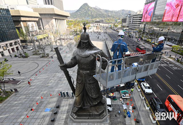 [포토] ‘때 빼고, 광내고’...봄맞이 묵은 때 씻는 이순신 장군
