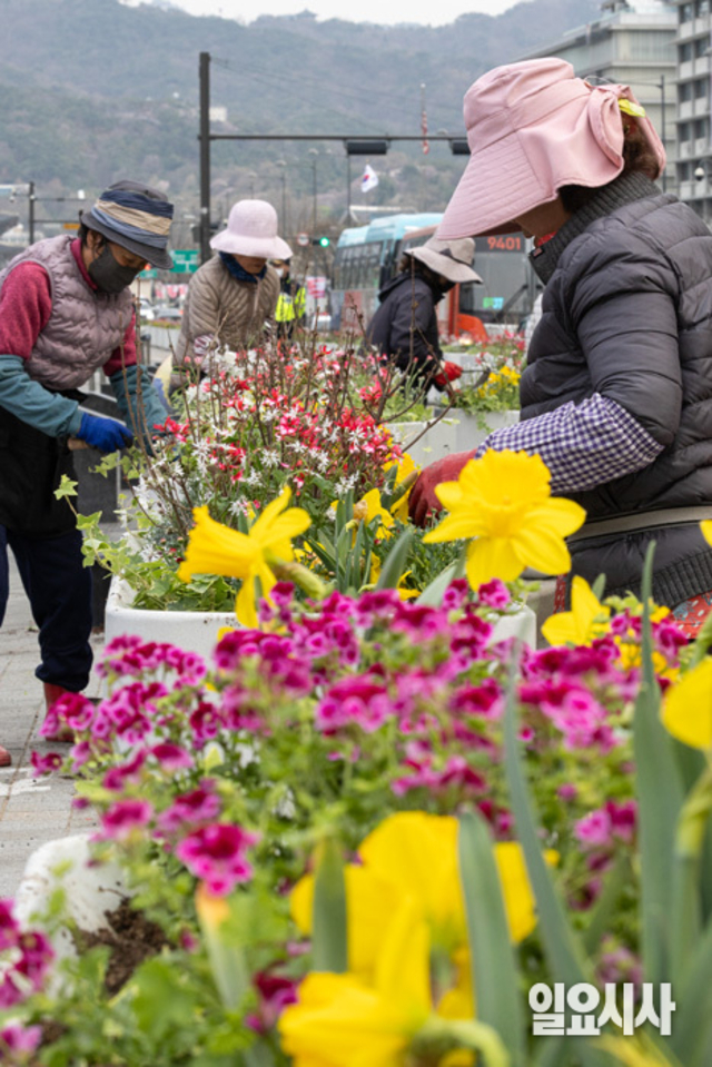 [포토] 화사한 꽃으로 봄맞이 단장 중인 광화문광장 화단