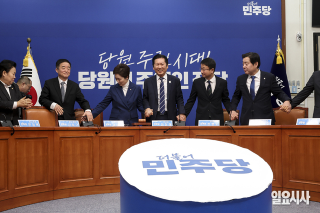 [포토] 최고위 앞서 손 맞잡은 더불어민주당 지도부