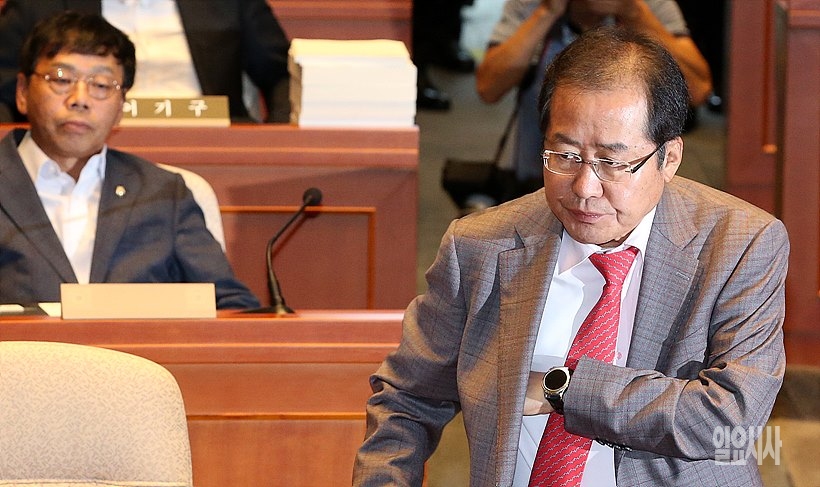 홍준표 자유한국당 대표가 5일, 서울 여의도 국회 예결위회의장서 예정된 긴급 의원총회에 참석하고 있다.