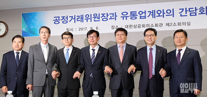 김상조 공정거래위원장이 6일 오전 서울 중구 대한상공회의소서 열린 유통업계 6개 사업자단체 대표와의 간담회에 참석해 기념촬영을 하고 있다. (왼쪽부터) 김도열 면세점협회 이사장, 박동운 백화점 협회장, 이갑수 체인스토어협회 회장, 김상조 위원장, 김형준 온라인쇼핑협 부회장, 조윤성 편의점 산업협회장