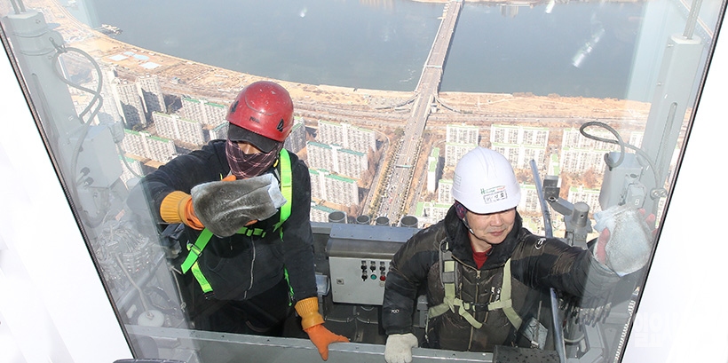 절기상 경칩인 6일 오전 서울 송파구 롯데월드타워서 전문 고소작업자들이 새봄을 맞아 외벽 유리를 청소하고 있다.