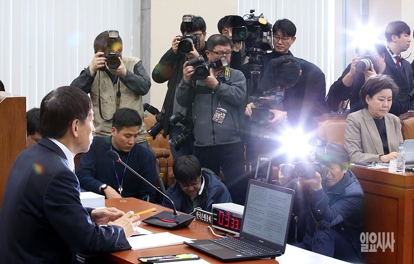 이주열 한국은행 총재 후보자가 21일, 서울 여의도 국회서 열린 인사청문회에 출석해 사진기자들의 플래시 세례를 받고 있다.