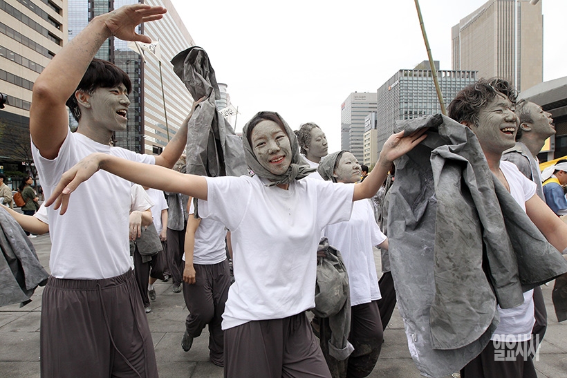 제주4.3사건 제70주년을 맞은 3일 오후 서울 종로구 광화문 광장에서 희생자들의 모습으로 분장한 시민들이 '4.3 대한민국을 외치다' 퍼포먼스를 하고 있다.