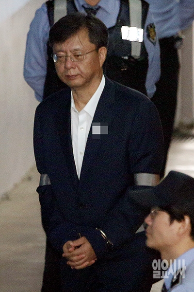 불법사찰 지시 혐의를 받고 있는 우병우 전 민정수석이 30일 오전 서울 서초구 서울중앙지법에서 열린 공판에 출석하고 있다.
