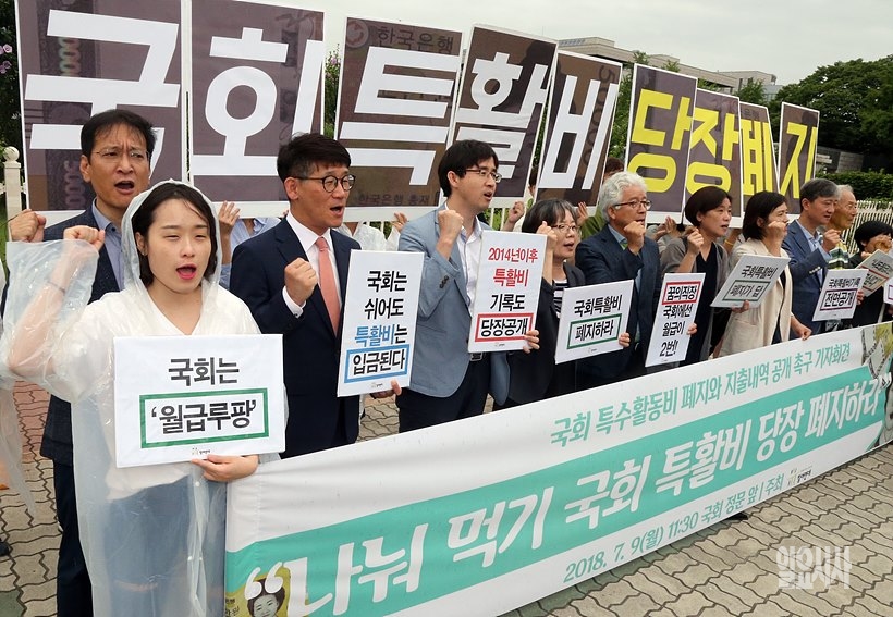 참여연대 회원들이 9일, 서울 여의도 국회 앞에서 국회 특수활동비 폐지와 지출내역 공개를 촉구하는 기자회견을 갖고 있다.