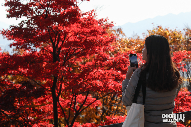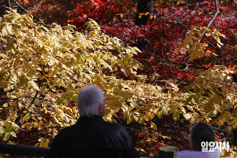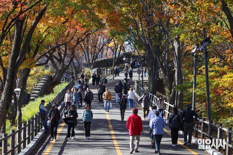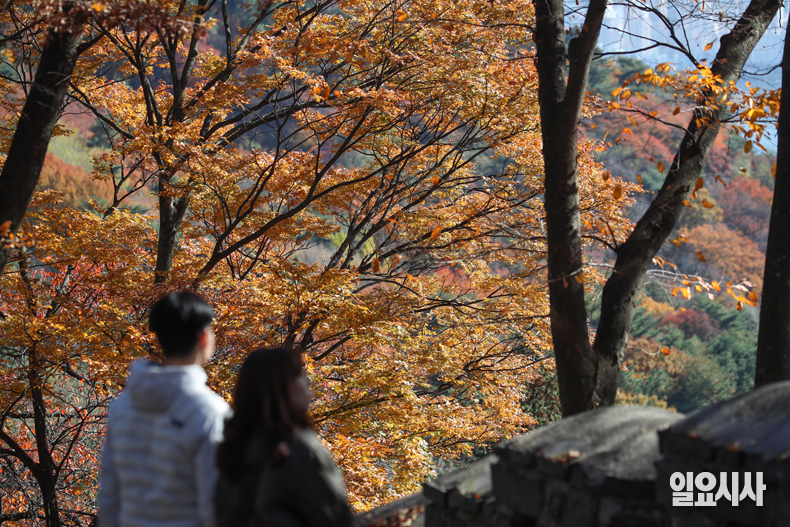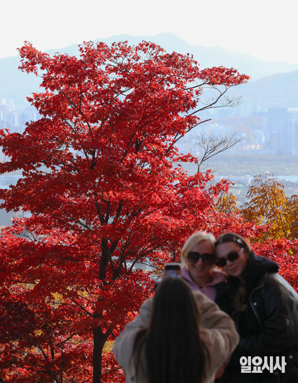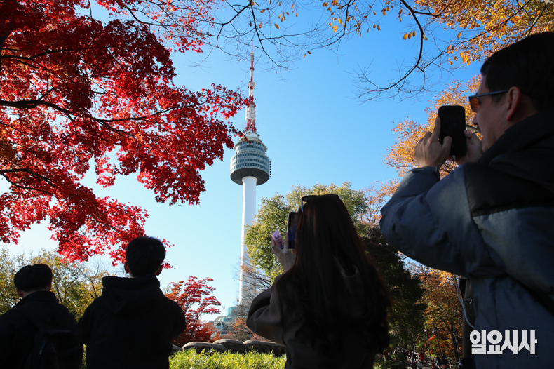 입동이 지나고 초겨울로 들어선 10일 오후 서울 중구 남산을 찾은 시민들이 알록달록한 단풍을 보며 가을 정취를 만끽하고 있다.