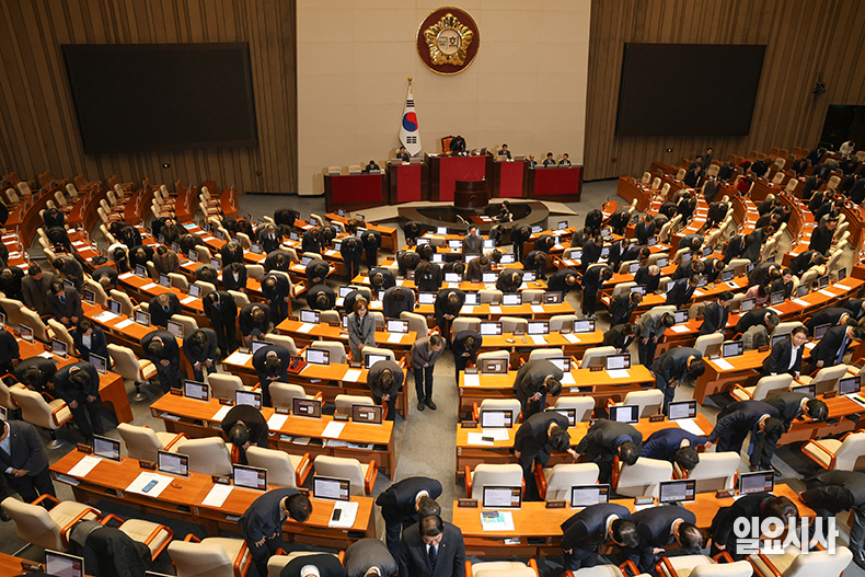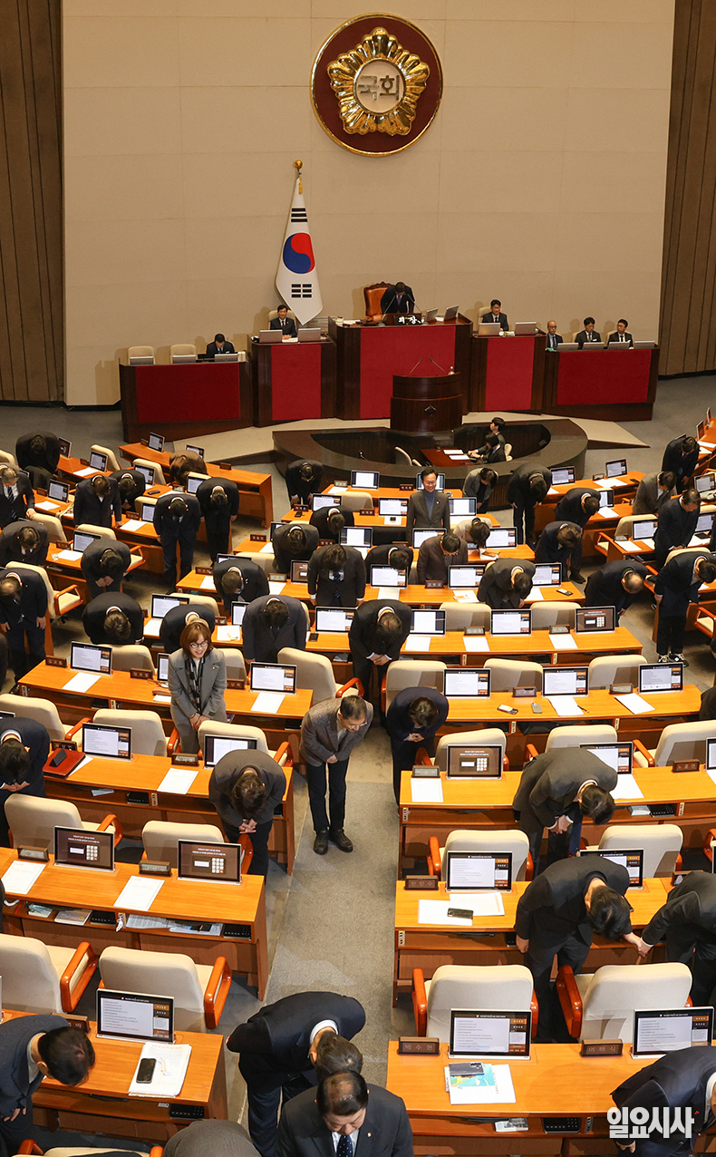 우원식 국회의장과 여야 의원들이 30일 오후 서울 여의도 국회에서 열린 제430회 국회(임시회) 제3차 본회의 종료 후 국민에게 인사를 하고 있다.