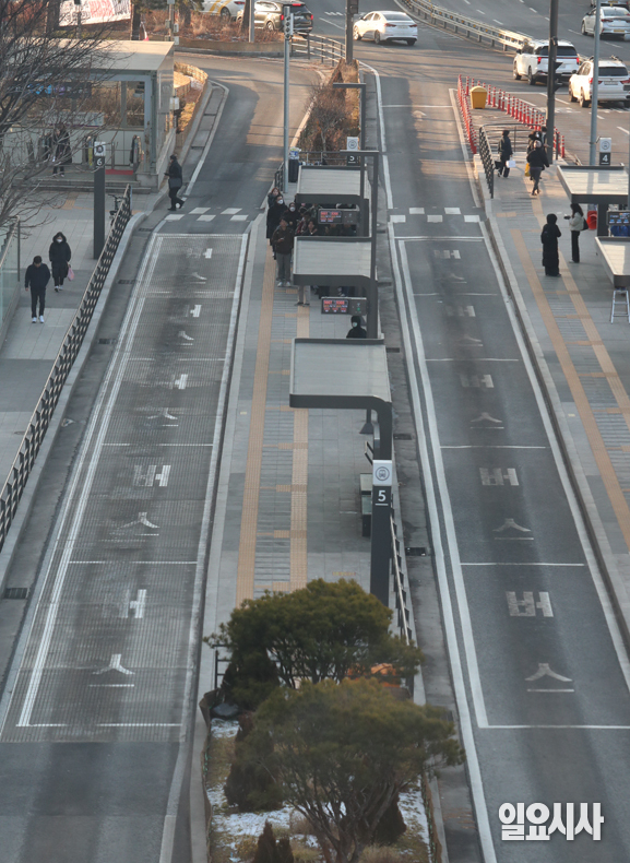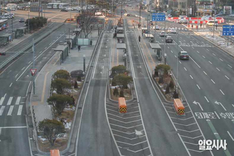 이틀 째 서울 시내버스 노조 파업으로 버스 운행이 중단된 가운데 14일 오전 서울 중구 서울역 버스 환승센터 전용차로가 도로가 비어있다.