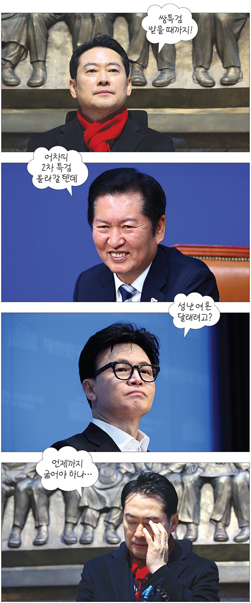 지난 15일 국민의힘 장동혁 대표가 국회서 단식 농성에 돌입했다. 여당을 향해 통일교의 정치권 로비 의혹과 공천헌금 의혹 등 이른바 쌍특검법 수용을 촉구한 것이다. 문제는 더불어민주당의 주도로 2차 특검법이 국회 문턱을 넘을 경우 단식을 이어갈 명분이 사라진다는 것이다. ‘한동훈 제명’ 반발로부터 눈을 돌리기 위한 꼼수가 아니냐는 지적도 제기된다. 단식 농성이 자충수라는 우려가 나오는 가운데 코너에 몰린 장 대표의 리더십 돌파구가 될지 지켜봐야 할 전망이다.
