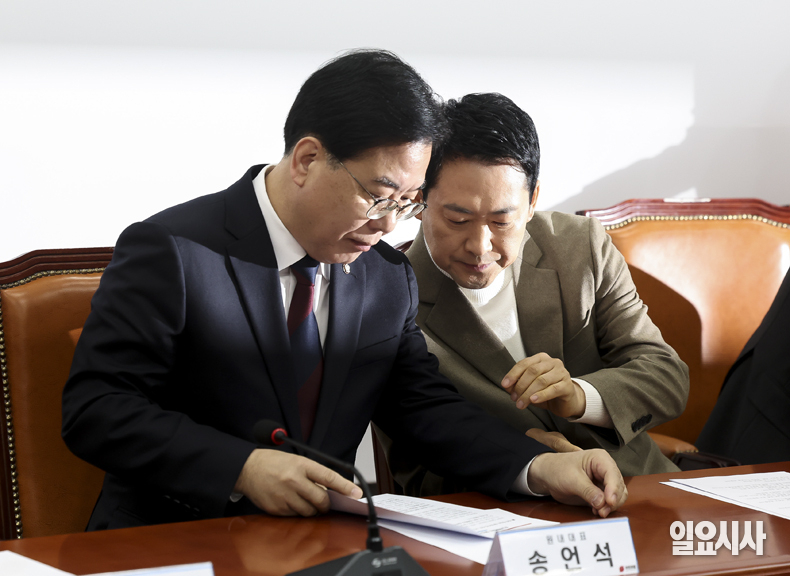 국민의힘 장동혁 대표(오른쪽)와 송언석 원내대표가 5일 오전 서울 여의도 국회에서 열린 최고위원회의에서 대화를 나누고 있다.
