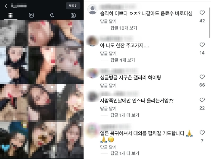 게시물 댓글창은 피해자에 대한 추모 대신 피의자의 외모를 평가하는 글들로 도배됐다. “예쁘면 무죄” “저런 외모면 나라도 따라가서 마셨다” “누나가 주는 약이라면 먹고 죽겠다” 등 범죄를 미화하고 피해자를 조롱하는 2차 가해성 댓글이 1800개 넘게 쏟아졌다.