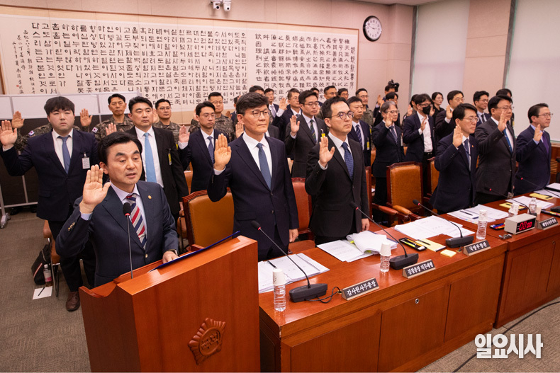 9일 오후 서울 여의도 국회에서 열린 ‘윤석열 정권 정치검찰 조작기소 의혹사건 진상규명 국조특위 전체회의’에 참석한 증인들이 증인선서를 하고 있다.