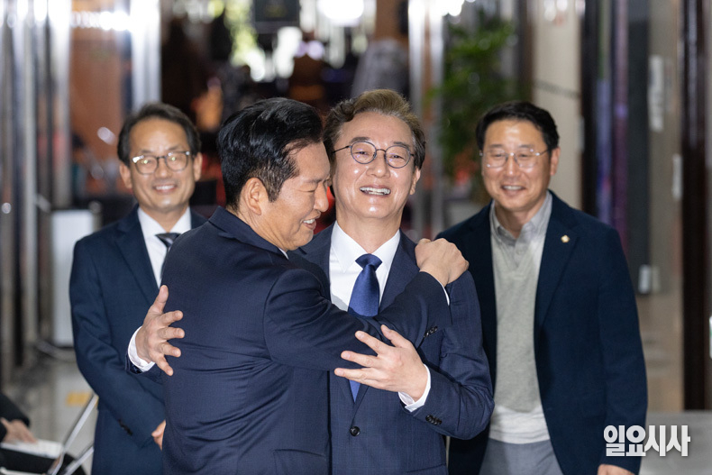 더불어민주당 정청래 대표(왼쪽)가 10일 오후 서울 여의도 국회에서 6.3 지방선거 부산시장 후보로 선출된 전재수 의원과 면담에 앞서 포옹하고 있다.
