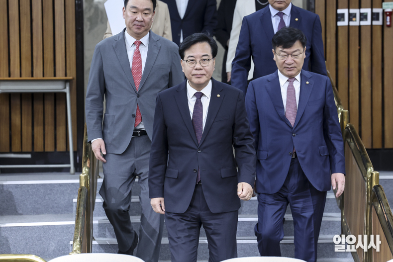 국민의힘 송언석 원내대표가 14일 서울 여의도 국회에서 열린 원내대책회의에 참석하고 있다.