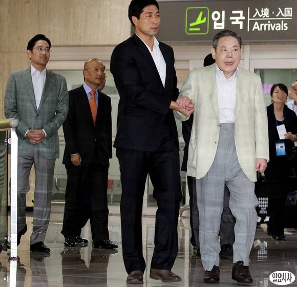 박근혜 대통령의 미국 방문 경제 사절단 자격으로 출국했던 이건희 삼성전자 회장이 일본을 거쳐 21일 오후 서울 김포국제공항을 통해 귀국하고 있다. 사진 맨 왼쪽은 마중나온 이재용 부회장의 모습.