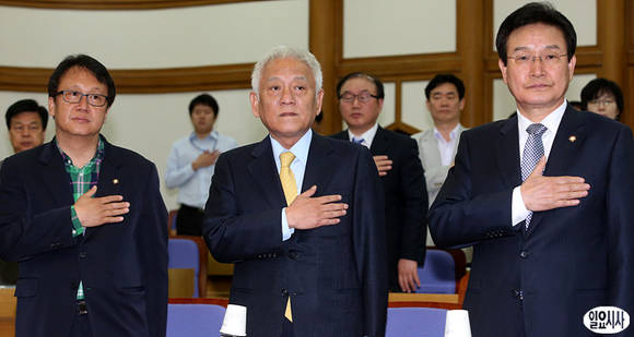 김한길 민주당 대표(사진 가운데)가 21일 오전 서울 여의도 국회 의원회관 1소회의실에서 열린 '민주당의 정책비전과 의제, 경제분야 토론회' 직전 민병두·변재일 의원(사진 오른쪽)과 함께 국기에 대한 경례를 하고 있다.