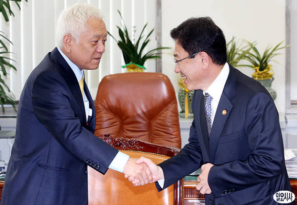 민주당 김한길 대표가 21일 국회 당대표실에서 회동 직후 윤상직 산업통상자원부 장관과 악수하고 있다.