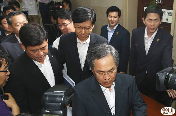 사진은 우윤근, 박민수 등 열람위원들이 소회의실 안으로 입장하려다가 관계자들로부터 제지를 받고 있다.