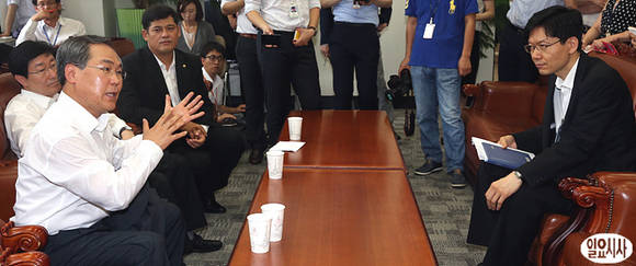 민주당 우윤근 간사(사진 왼쪽) 등 소속 2007년 남북정상회담 대화록 열람위원들이 23일, 정상회담 관련 사전준비·사후이행 문건 열람을 시도하다가 수포로 돌아가자 관계자와 회동해 이야기를 나누고 있다.