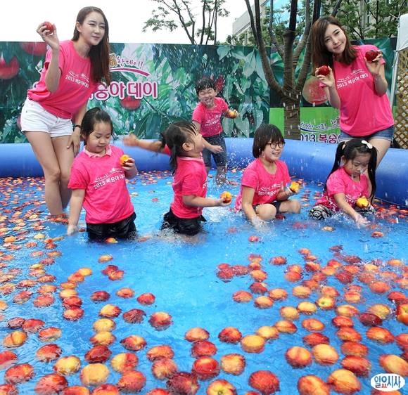 23일 오전 서울광장에서 농협과 한국복숭아생산자협의회 주최로 열린 '2013 복숭아데이' 행사에서 어린이들이 복숭아가 가든 찬 풀장에서 물놀이를 하고 있다.
