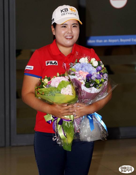 '골프 여왕' 박인비가 23일 오후 인천국제공항을 통해 귀국, 꽃다발을 들고 미소를 짓고 있다.