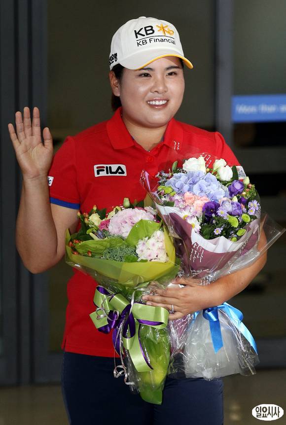 '골프 여왕' 박인비가 23일 오후 인천국제공항을 통해 귀국, 꽃다발을 들고 인사하고 있다.