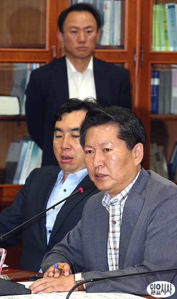 23일 오전, 국회에서 열린 민주당 원내대책회의서 남북정상회담 대화록과 관련해 정청래 의원(사진 오른쪽)이 발언하고 있다.
