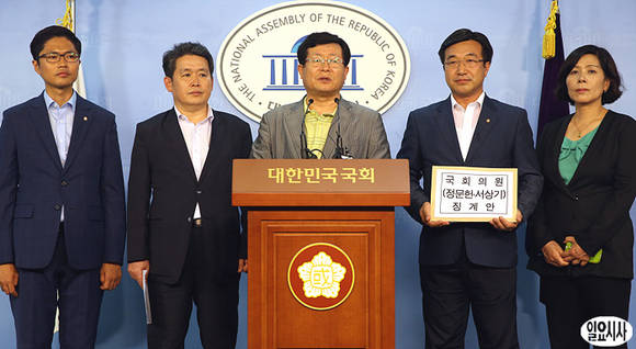 윤호중 민주당 의원 등이 23일 오후 국회 정론관에서 새누리당 정문헌·서상기 의원에 대한 징계안을 제출하기 앞서 기자회견을 열고 있다. 왼쪽부터 김광진, 김경협, 윤호중, 최민희, 설훈 의원