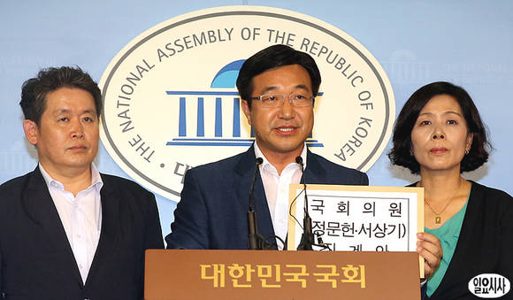윤호중 민주당 의원 등이 23일 오후 국회 정론관에서 새누리당 정문헌ㆍ서상기 의원에 대한 징계안을 제출하기 앞서 기자회견을 열고 있다. 왼쪽부터 김광진, 김경협, 윤호중, 최민희, 설훈 의원