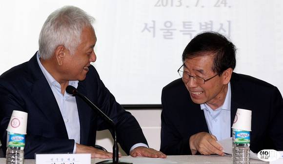 김한길 민주당 대표(왼쪽)와 박원순 서울시장이 24일 오전 서울 성북구 석관동 주민자치센터에서 열린 현장 최고위원회의에 참석, 서로 이야기를 하고 있다.
