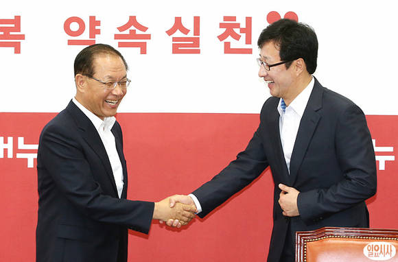 24일 오전 서울 국회 새누리당 대표실에서 황우여 새누리당 대표(사진 왼쪽)와 천호선 정의당 신임 대표가 악수를 나누고 있다.