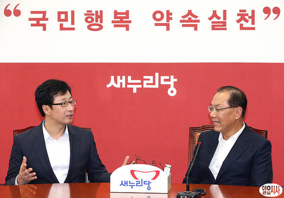 24일 오전 서울 국회 새누리당 대표실에서 황우여 새누리당 대표(사진 오른쪽)와 천호선 정의당 신임 대표가 이야기를 나누고 있다.