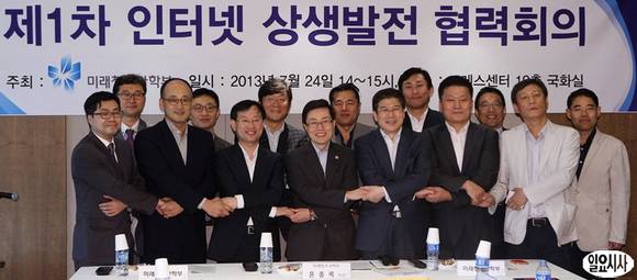 24일 오후 서울 중구 프레스센터에서 열린 '제1차 인터넷 상생발전 협력회의'에서 윤종록 미래창조과학부 제2차관(앞줄 왼쪽에서 네번째)을 비롯한 참석자들이 손을 맞잡고 기념촬영을 하고 있다.