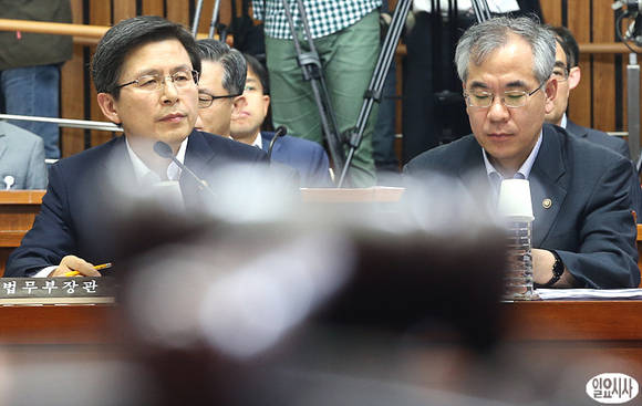 황교안 법무부 장관(사진 왼쪽)이 24일 국회에서 열린 국가정보원 댓글 의혹 사건 등의 진상규명을 위한 국정조사특위에 증인으로 출석, 여야 위원들의 질문을 경청하고 있다.