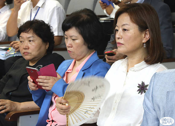 국가정보원 댓글의혹 사건 등의 진상규명을 위한 국정조사 특별위원회 위원을 전격 사퇴한 민주당 김현(사진 오른쪽)-진선미 의원이 24일 국회에서 열린 특위 전체회의장을 찾아 방청석에서 회의를 지켜보고 있다. 김현, 진선미 의원은 각각 민주당 내 국조특위 대변인과 지원단장을 맡았다.