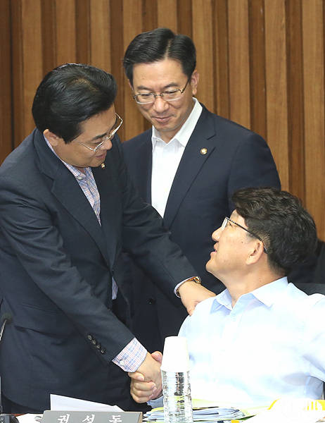 새누리당 권성동(사진 가운데), 민주당 전병헌(사진 왼쪽), 정성호 국정원 댓글 의혹사건 국조특위 위원이 24일 국회에서 열린 회의에서 웃으면서 대화를 나누고 있다.