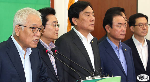 24일 오후, 민주당 김한길 대표(사진 왼쪽)와 최고위원들이 국정원 댓글 의혹 사건 진상규명을 위한 국조특위에 관련 긴급 기자회견을 갖고 있다.
