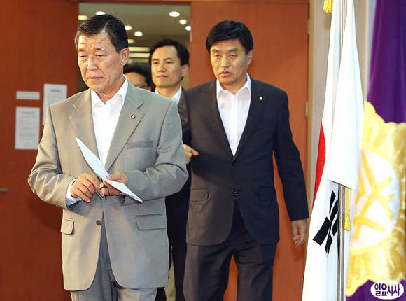 황진하 새누리당 간사(사진 왼쪽) 등 2007년 남북정상회담 대화록 새누리당 열람위원들이 24일 오후 국회 정론관에서 기자회견을 갖기 위해 정론관으로 입장하고 있다.