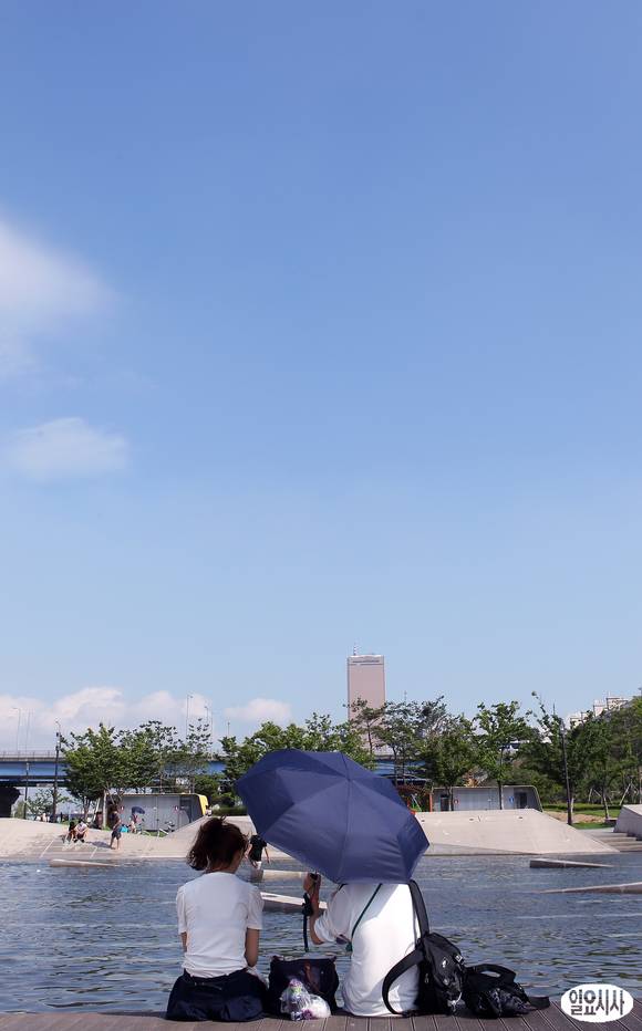장마가 잠시 주춤, 전국적으로 무더운 날씨를 보인 24일 서울 여의도 한강공원 물빛광장을 찾은 시민들이 더위를 식히고 있다.