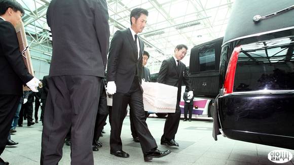 25일 오전 서울 풍납동 서울아산병원에서 故 김종학 PD의 발인식이 열리고 있는 가운데 운구 행렬이 장례식장을 빠져나오고 있다.