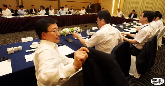 25일 오후 서울 서초구 팔래스호텔에서 열린 '산업혁신운동 3.0 특별운영위원회'에서 참석자들이 윗옷을 벗고 있다.