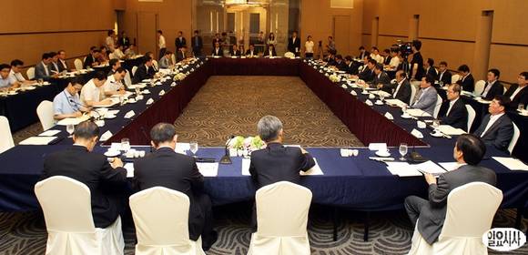 윤상직 산업통상자원부 장관을 비롯한 참석자들이 25일 오후 서울 서초구 팔래스호텔에서 '산업혁신운동 3.0 특별운영위원회'를 갖고 있다.