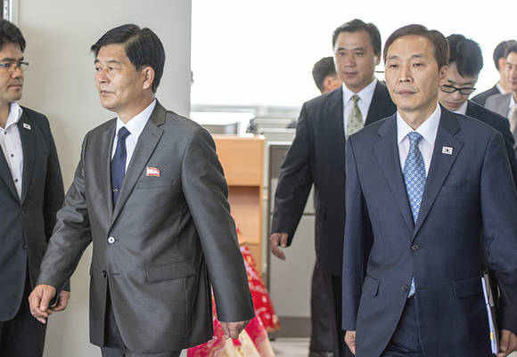 제6차 개성공단 남북당국실무회담이 25일 오전, 개성공단 종합지원센터 회의실에서 열렸다. 남측 수석대표인 김기웅(사진 오른쪽) 남북협력지구지원단장과 북측 수석대표인 박철수 중앙특구개발지도총국 부총국장이 회담장 안으로 들어서고 있다. (사진공동취재단)