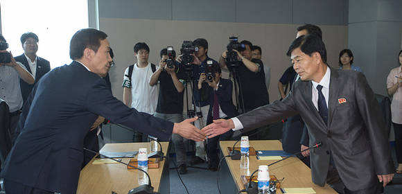 제6차 개성공단 남북당국실무회담이 25일 오전, 개성공단 종합지원센터 회의실에서 열렸다. 남측 수석대표인 김기웅(오른쪽) 남북협력지구지원단장과 북측 수석대표인 박철수 중앙특구개발지도총국 부총국장이 회담장 안에서 무덤덤한 표정으로 악수를 나누고 있다. (사진공동취재단)