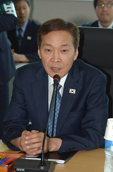 제6차 개성공단 남북당국실무회담이 25일 개성공단 종합지원센터 회의실에서 열린 가운데, 남측 수석대표인 김기웅 남북협력지구지원단장이 북측 수석대표인 박철수 중앙특구개발지도총국 부총국장 등 북측 대표단 측에 발언하고있다. (사진공동취재단)