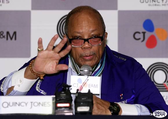 '팝의 전설' 퀸시 존스가 25일 오후 서울 삼성동 코엑스인터컨티넨탈 호텔에서 CJ E&M & 퀸시 존스 '글로벌 뮤직 파트너십' MOU 체결식에서 취재진의 질문에 답하고 있다.